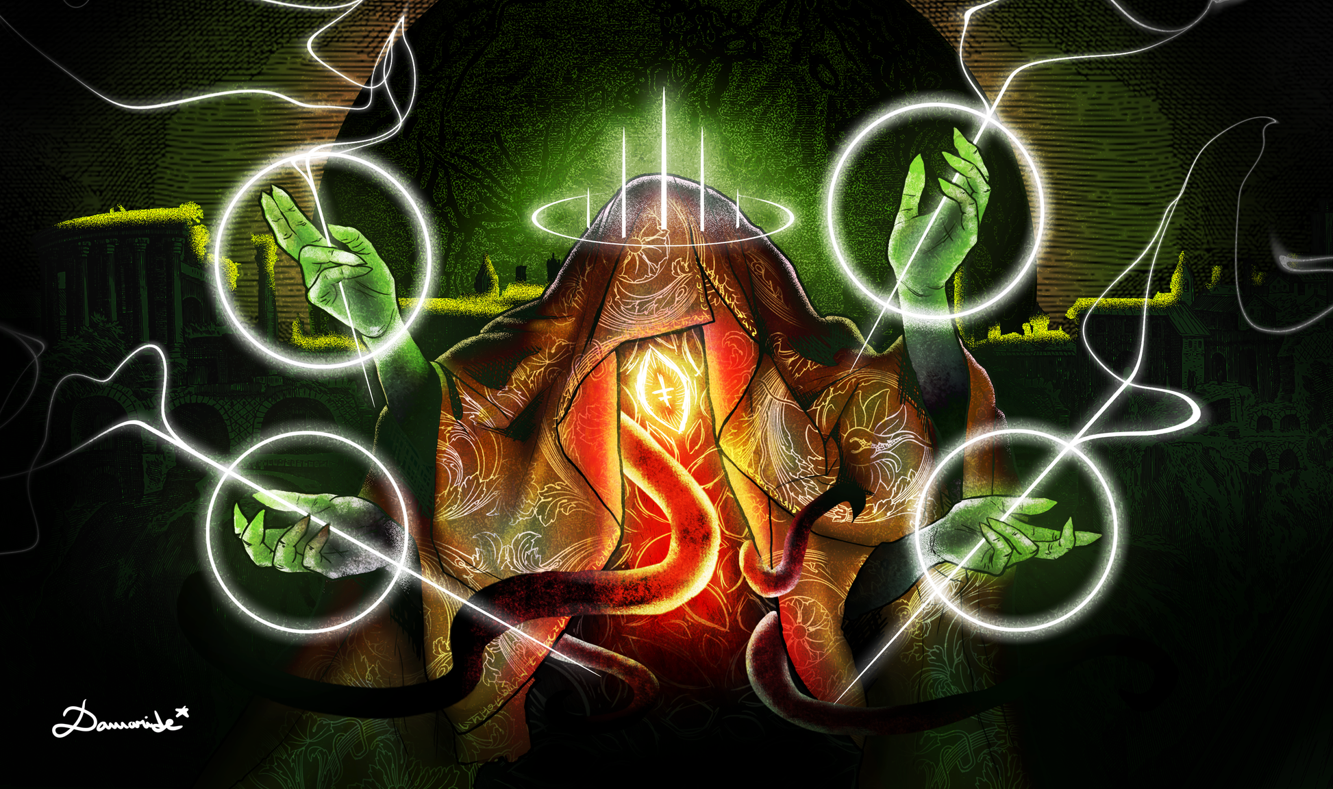 Molecular biotechnologist in the streets, artist in the sheets. Professional digital and traditional alterist for a decade, cat cuddler, PhD in sharp eyeliner application. My passion is creating designs inspired by classical art, the cosmos, and alchemy. You can find me through Fiverr (Damaride), Patreon, Instagram (both DamarideNeurommancer), or goat entrail divination for commissions or adoration- I mean, suggestions!